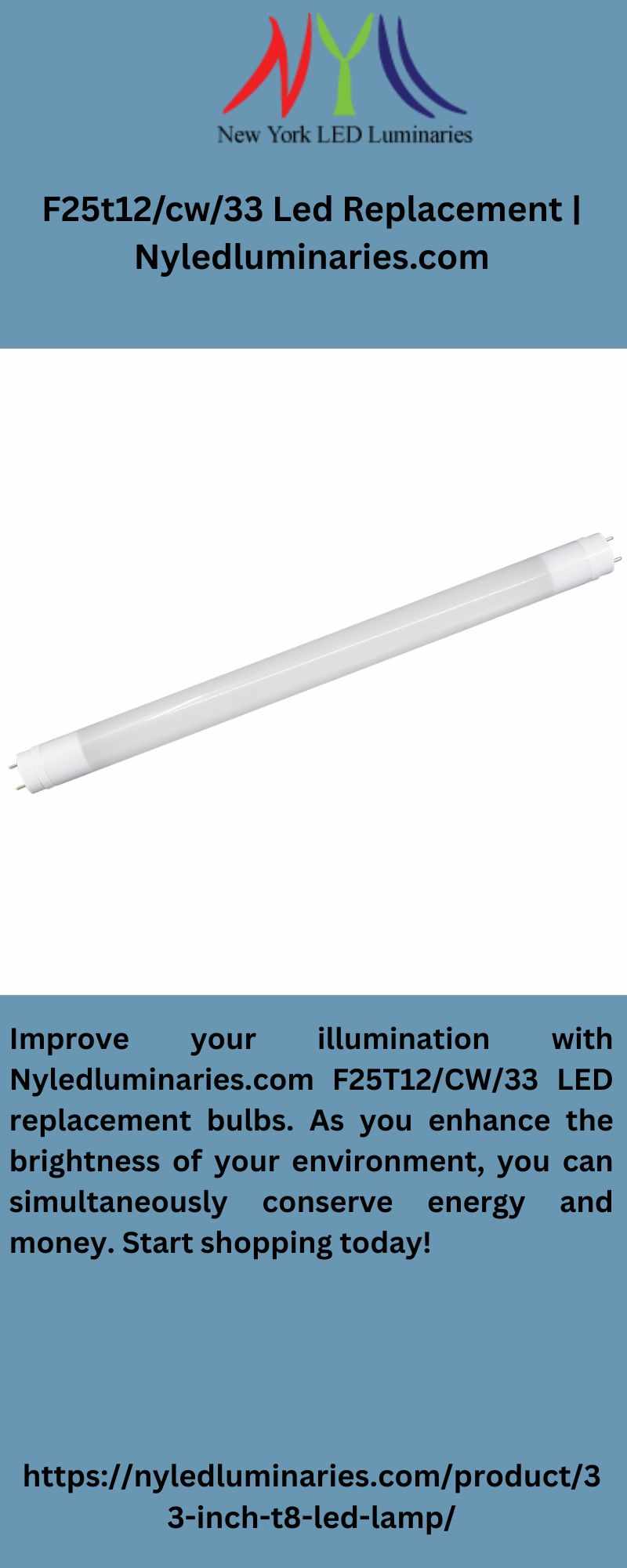 Improve your illumination with Nyledluminaries.com F25T12/CW/33 LED replacement bulbs. As you enhance the brightness of your environment, you can simultaneously conserve energy and money. Start shopping today!